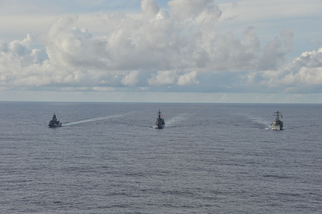 (Từ trái qua) Tàu hộ vệ tên lửa HMAS Arunta của Australia, tàu khu trục JS Kirisame của Nhật Bản và tàu khu trục USS John S.McCain của Mỹ diễn tập trên Biển Đông. (Ảnh: Hải quân Mỹ)