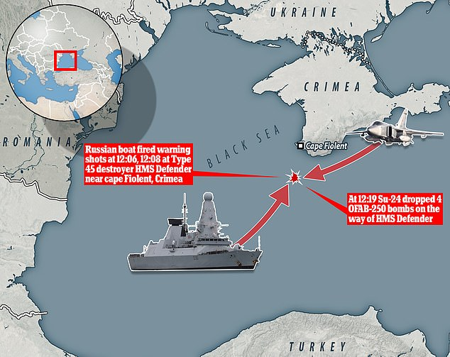 "Khoảng 12 giờ 06 phút tới 12 giờ 08 phút, một tàu tuần tra của Biên phòng Nga đã bắn cảnh cáo. Đến 12 giờ 19 phút, một tiêm kích bom Su-24M đã ném bom cảnh báo với 4 quả bom phân mảnh OFAB-250 theo hướng di chuyển của tàu HMS Defender của chuyển động", thông báo của Bộ Quốc phòng Nga cho biết thêm.