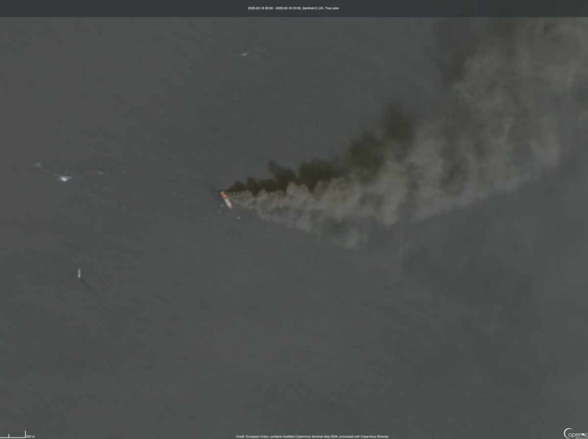 Hình ảnh vệ tinh chụp ngày 18/3 cho thấy những cột khói lớn bốc lên từ tàu container Safeen Prestige mang cờ Malta khi nó đang trôi dạt trên eo biển Hormuz.