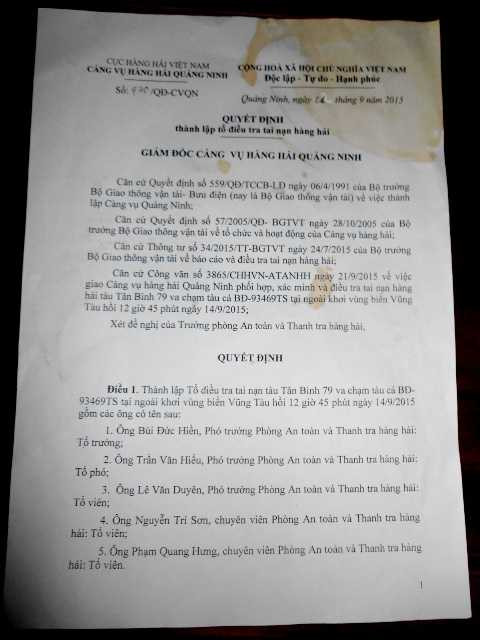 “Ngay sau khi nhận được thông tin từ Cảng Vụ hàng hải Vũng Tàu, các cơ quan hữu quan, và đơn phản ánh của chủ tàu Nguyễn Văn Linh, ngày 24/9/2015 Cảng Vụ hàng hải Quảng Ninh đã thành lập đoàn kiểm tra, sau đó chúng tôi đến tận nhà của vợ chồng anh Linh ở Bình Định để lấy lời khai, kiểm tra giấy tờ, cũng như các thông tin khác liên quan đến vụ việc” – ông Hiền nói.