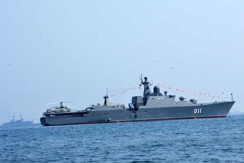 Tàu hộ vệ tên lửa 011 Đinh Tiên Hoàng đại diện cho lực lượng tàu Hải quân Việt Nam tham gia duyệt binh đã ghi dấu ấn về lần đầu tiên tham dự.