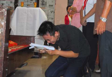 | Con trai lái tàu Lê Minh Phú đau đớn bên linh cữu cha. |