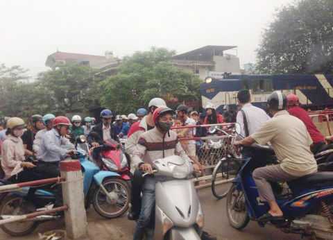 Cả đoàn tàu phải dừng khẩn cấp để nhường đường cho hàng loạt xe máy 'xé rào' ùn ùn lao tới băng qua đường sắt.