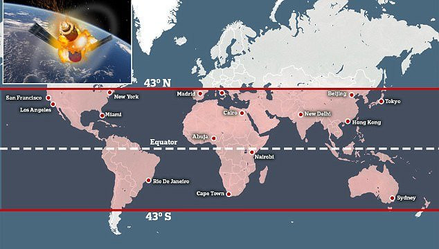 Các nhà khoa học chỉ có thể dự đoán chính xác thời gian và địa điểm tàu vũ trụ rơi chạm Trái Đất vào tuần cuối cùng. (Ảnh: Daily Mail)