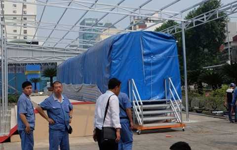 Để phục vụ quá trình lắp đặt, đoàn tàu mẫu đang được phủ kín bằng bạt. Các công nhân đang lắp đặt hệ thống khung bạt, mái che, thang lên xuống và một số hạng mục phục vụ cho công tác trưng bày.