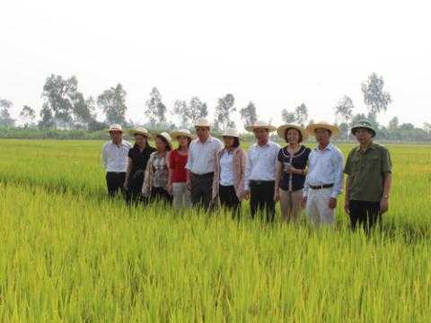 | Ông Vũ Mạnh Hiền (thứ hai từ phải sang) cùng với một số cán bộ đi kiểm tra giống lúa mới năm 2013 |