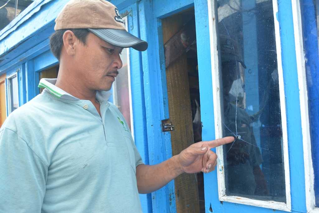 | Lỗ thủng trên tàu QNa-91865 TS mà ngư dân trình báo bị tàu xưng của Trung Quốc bắn đạn bi sắt làm vỡ kính tàu. Ảnh: Hồng Anh. |