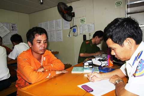Anh Vũ Xuân Sang (áo cam) đang được lấy lời khai ngay trên tàu ngày 11/10/2014. Ảnh: Phan Cường
