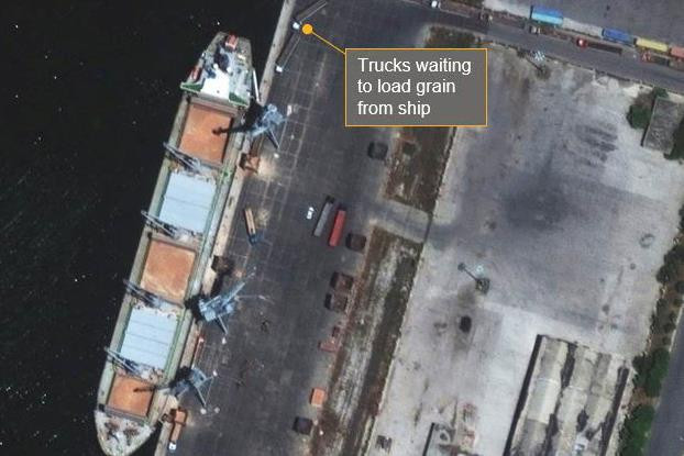 Sau đó, vệ tinh Maxar cập nhật hình ảnh của những con tàu này tại cảng ở Syria. Nhiều xe bán tải đã xếp hàng sẵn để chờ tiếp nhận số ngũ cốc.