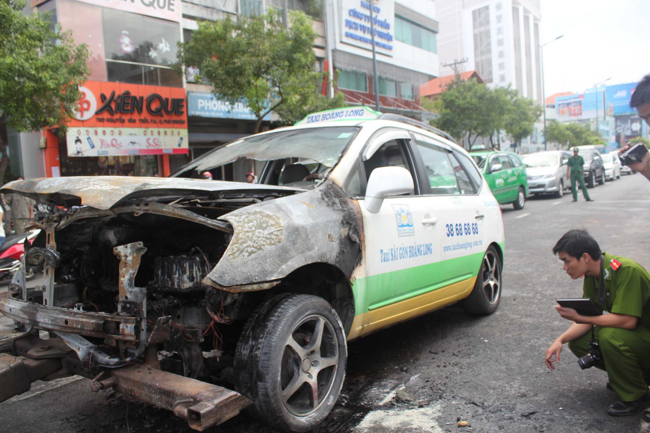 Tại hiện trường, chiếc xe taxi bị cháy rụi phần mui xe, nhiều mảng nhựa trên xe nóng chảy xuống đường, phần kính chắn gió phía trước cũng bị cháy sém, bể loang lổ nhiều chỗ.