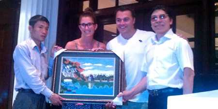 | Đại diện taxi Trung Việt cùng Chủ tịch Hiệp hội taxi Hà Nộitặng quà và xin lỗi vợ chồng du khách bị 'bắt chẹt' |