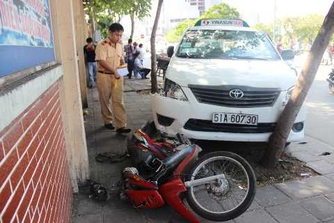 Chiếc taxi đâm vào xe ba gác của người bán trái cây, tiếp tục cuốn một xe máy BKS 63B2 - 113.16 của người đàn ông đang dừng vỉa hè, húc nghiêng cây xanh bên đường mới chịu dừng lại.