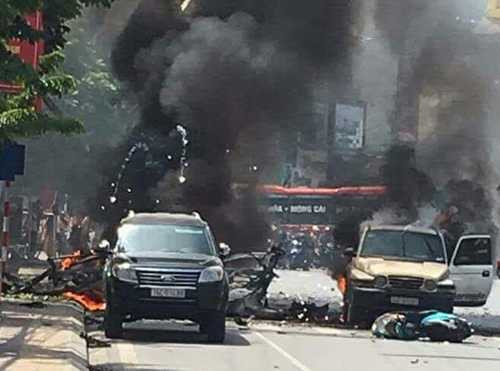 Chiếc xe máy của nạn nhân tử vong đi cùng chiều và chiếc ô tô đi sau xe taxi cũng bốc cháy ngùn ngụt. Một số cửa kính của nhà dân gần vụ nổ bị vỡ kính và một chiếc xe bên kia đường bị áp lực vụ nổ làm móp đầu.