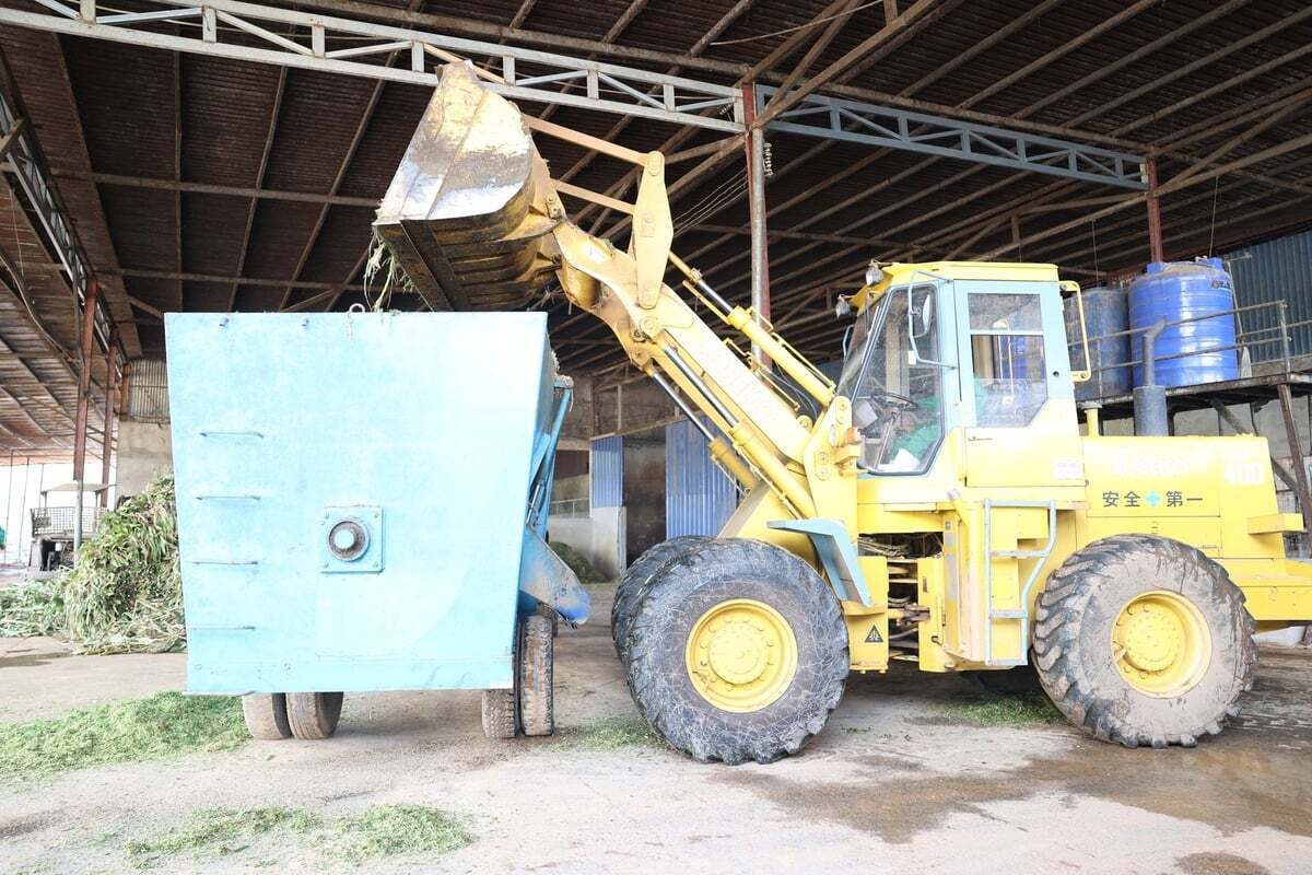 Công ty Pacow dùng xe cơ giới chuyên dụng phối trộn thức ăn cho đàn bò.