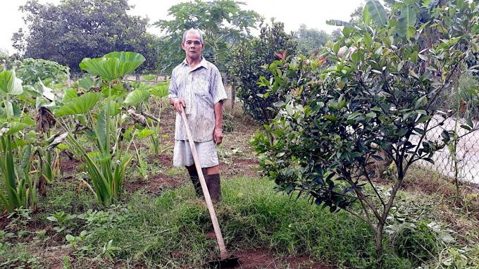Cơ ngơi của gia đình ông Thàm ngoài hơn 1ha cao su còn những mảnh vườn trồng nhiều loại rau, cây thuốc nam. Ông bảo, rất thích ngồi bệt xuống đất, vuốt ve những lá cây trên chính mảnh vườn nhà mình. Ảnh: Phúc Lập.