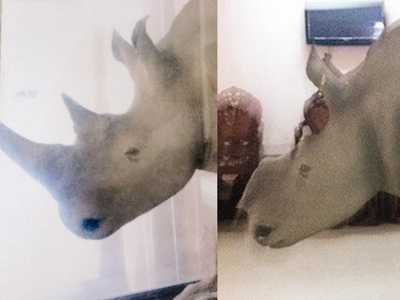 | Đầu con tê giác trưng bày ở Bộ Tư lệnh Quân khu 9 và đầu con tê giác mất sừng ở nhà ông Trầm Bê |
