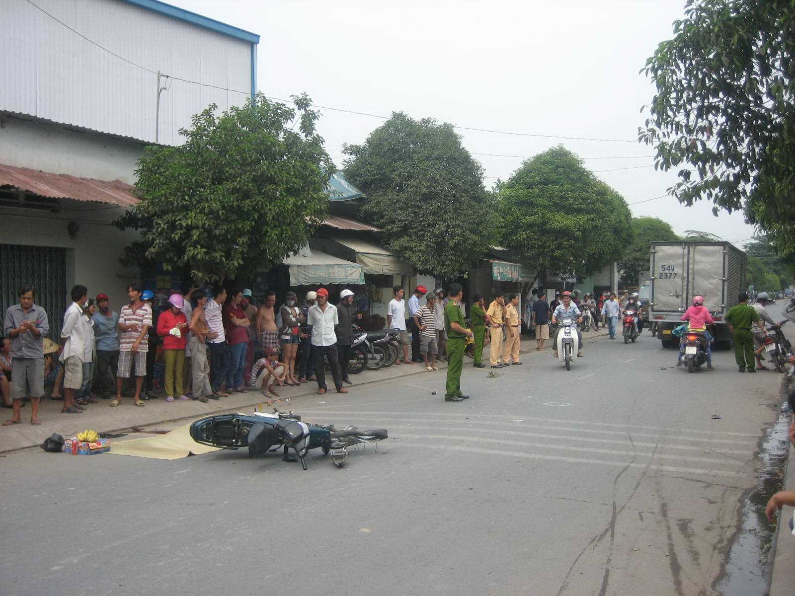 | Hiện trường vụ tên cướp giật dây chuyền tháo chạy và đâm đầu vào xe tải dẫn đến tử vong |