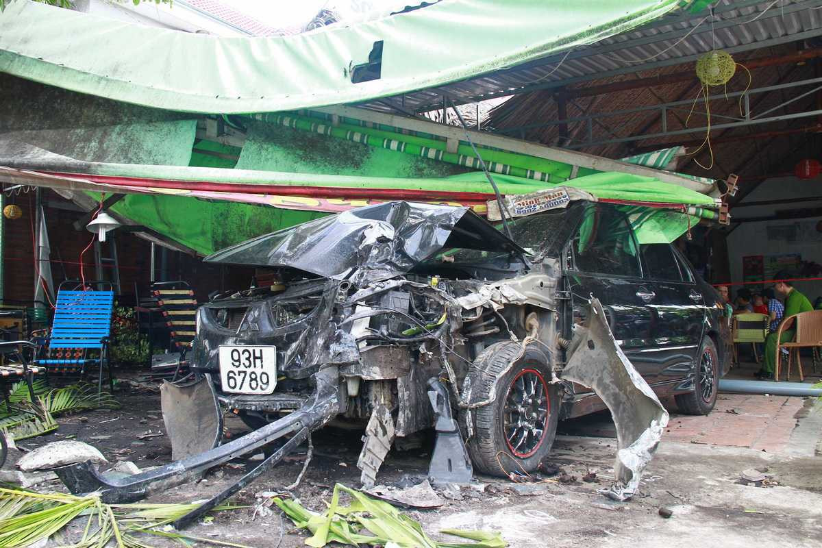 Tại hiện trường, chiếc xe 4 chỗ bị bể nát phần đầu, hư hỏng nặng, cột điện trước quán cà phê bị tông đổ. Bên trong, phần mái che của quán cà phê bị tông sập, bàn ghế văng khắp quán. Một chiếc xe máy của khách để gần đó cũng bị chiếc xe này kéo lê vào quán.