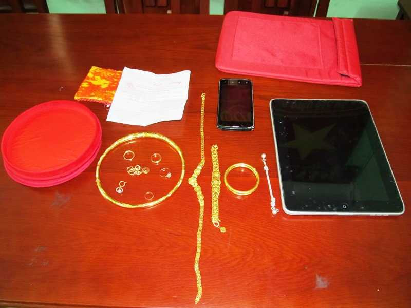 Qua kiểm tra trên người Sơn, công an phát hiện có cất giấu nhiều tài sản có giá trị gồm 1 Ipad màu trắng; 1 điện thoại di động hiệu Vinaphone màu đen; 1 vòng đeo cổ bằng vàng 24k trọng lượng 3 chỉ; 1 lắc đeo tay vàng 24k trọng lượng 5 chỉ; 1 dây chuyền vàng 24k trọng lượng 5 chỉ; 1 vòng đeo tay vàng 24k trọng lượng 2 chỉ; 1 đôi bông tai vàng 18k trọng lượng 4,2 phân; 1 chiếc bông tai vàng 18k trọng lương 4,1 phân; 1 lắc đeo tay bằng bạc trọng lượng 1,5 chỉ và 4 nhẫn vàng. Tổng giá trị tài sản trên ước tính khoảng trên 50 triệu đồng.