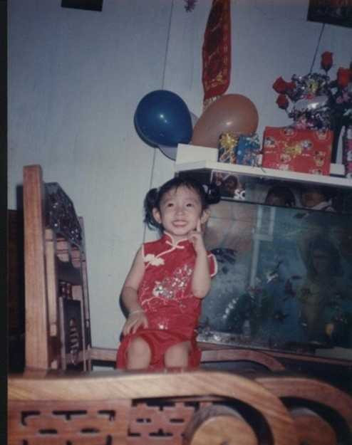 Bé gái Khổng Tú Quỳnh cười rạng rỡ vì được mặc đồ đẹp trong một dịp Tết. Vì là người gốc Hoa nên Tết Khổng Tú Quỳnh cũng được bố mẹ cho mặc sườn xám để đi chơi.