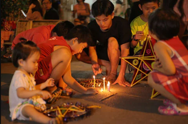Hình ảnh Tết Trung thu ở Việt Nam gắn với các loại đèn truyền thống như đèn kéo quân, đèn con cá, đèn ông sao... Tại các vùng quê, cứ đến những ngày tháng tám, vào buổi tối trẻ em hàng đoàn rồng rắn rước đèn trong tiếng trống, rộn ràng cả xóm làng.