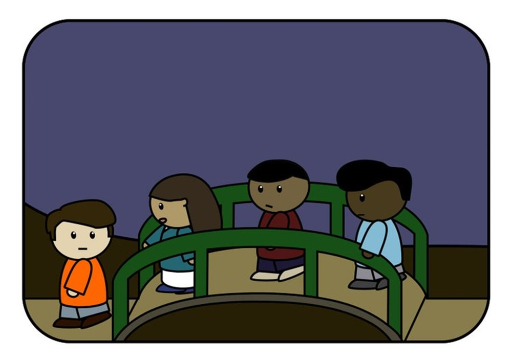 Bốn người cần đi qua sông. Con sông có một cây cầu hẹp chỉ có thể chứa hai người cùng một lúc. Lúc đó là ban đêm, họ chỉ có một ngọn đuốc và mỗi lượt qua cầu đều cần dùng đến ngọn đuốc này để soi đường. Người A có thể qua cầu trong 1 phút, B đi mất 2 phút, C mất 5 phút và D là 8 phút. Khi hai người cùng nhau qua cầu thì họ phải chuyển động với vận tốc của người đi chậm hơn.