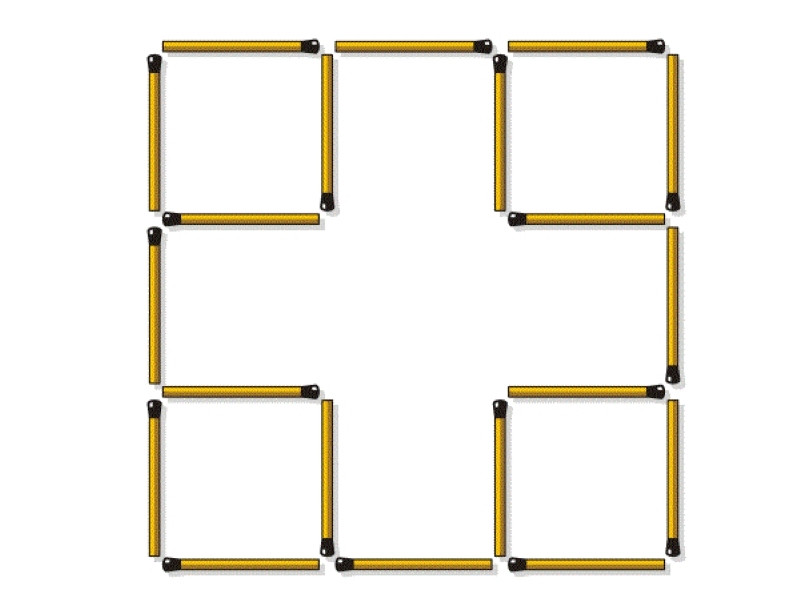 20 que diêm được xếp thành 5 hình vuông, bao gồm một hình lớn 3x3 và 4 hình nhỏ 1x1, như hình dưới. Làm thế nào để tạo thành 7 hình vuông mà chỉ di chuyển hai que diêm?