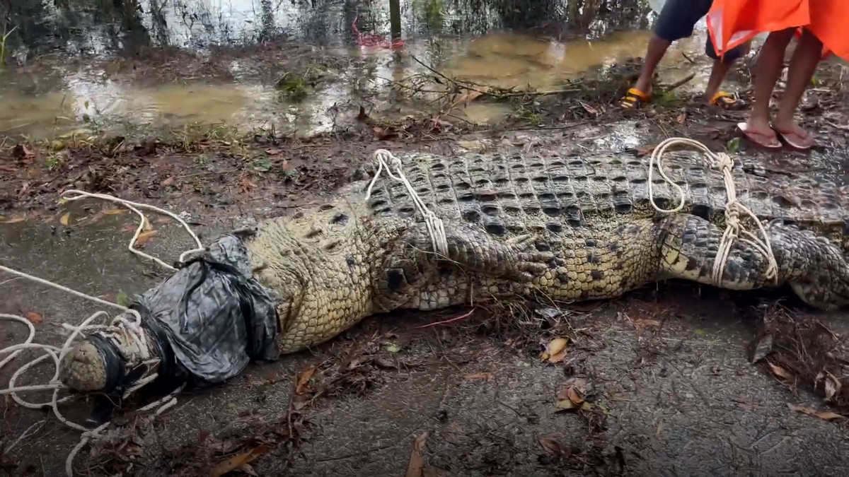 Người dân địa phương vật lộn với con cá sấu nặng nửa tấn được tìm thấy dưới sông sau khi cơn bão ở Thái Lan đi qua.