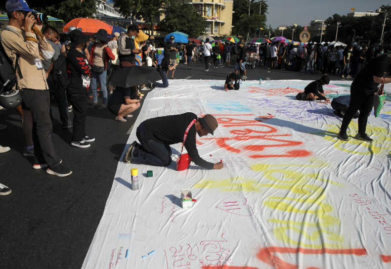 Hôm 14/11, khoảng 2.500 người biểu tình tập trung tại Đài tưởng niệm Dân chủ ở thủ đô Bangkok của Thái Lan. Họ hát và nhảy múa bày tỏ quan điểm phản đối với chính phủ.