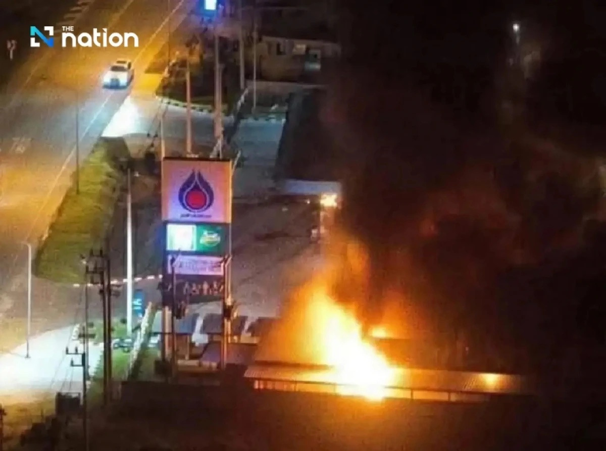 Một cây xăng PTT bốc cháy trong loạt vụ tấn công ở các tỉnh cực Nam Thái Lan rạng sáng 11/1/2026. (Ảnh: The Nation)