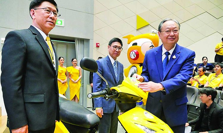 Ông Sontirat Sontijirawong (áo xanh bên phải), Bộ trưởng Năng lượng gắn nhãn dán cho một chiếc xe máy điện Toyotron Motor do Thái Lan sản xuất, một trong 12 nhà sản xuất xe máy điện địa phương.