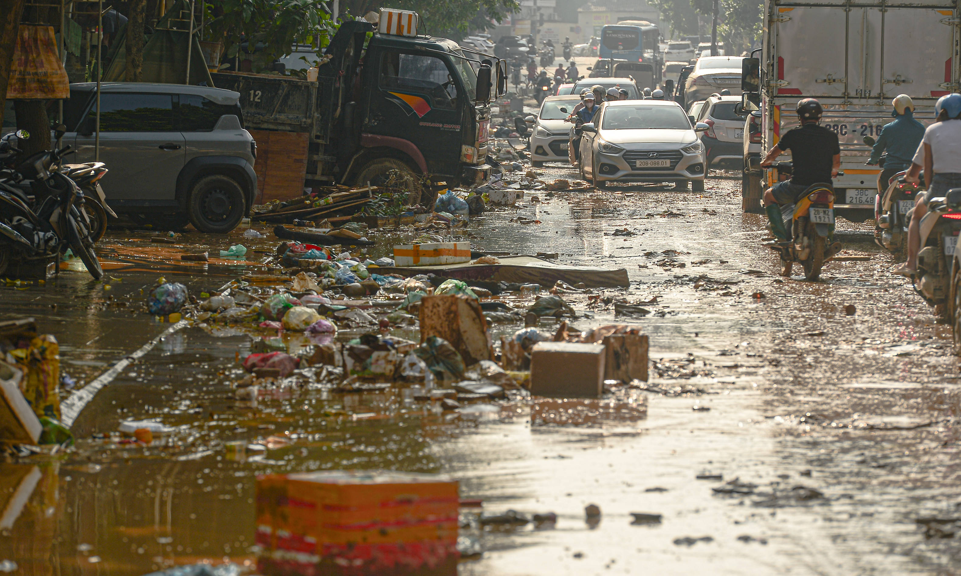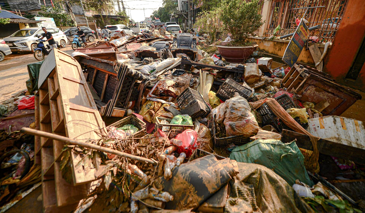 Khi nước rút, khung cảnh hiện ra khiến ai đi qua cũng không khỏi xót xa, phố xá bừa bộn, tường nhà loang lổ vết bùn, đồ đạc vương vãi khắp nơi. “Bùn dày đến mắt cá chân, rác thì chất thành từng đống lớn. Phải dùng máy xúc mới gom kịp”, một công nhân môi trường chia sẻ.