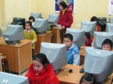 Cô giáo Bùi Thị Thanh Hằng, Hiệu trưởng trường TH Thịnh Liệt, quận Hoàng Mai, HN rất tự hào với hệ thống máy tính cấu hình mạnh, có trang bị cả tai nghe được kết nối mạng tốt.