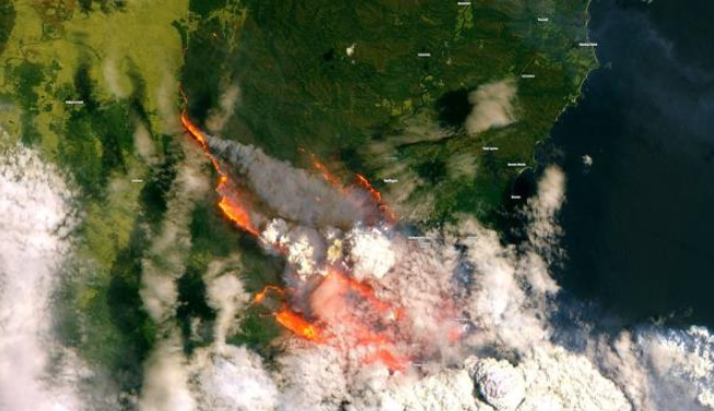Ảnh vệ tinh chụp lại các đám cháy tàn phá thị trấn ven biển BHRans, phía Nam bang New South Wales. (Ảnh: EMS)