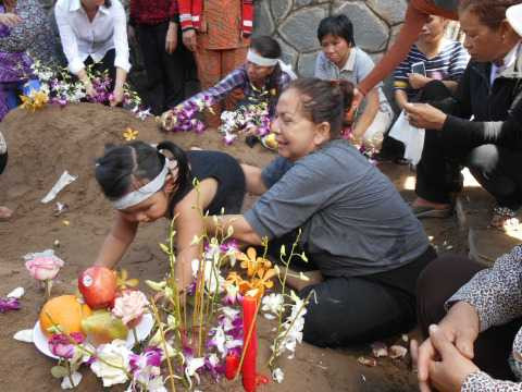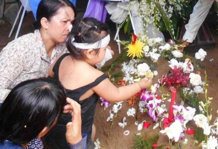 | Bé Na hồn nhiên bên mộ cha mẹ chiều 11/7. Ảnh: Phan Cường |