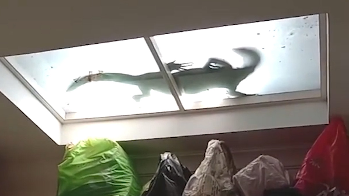 Thằn lằn dài 1,5m xuất hiện trên cửa sổ trời nhà dân ở Thái Lan