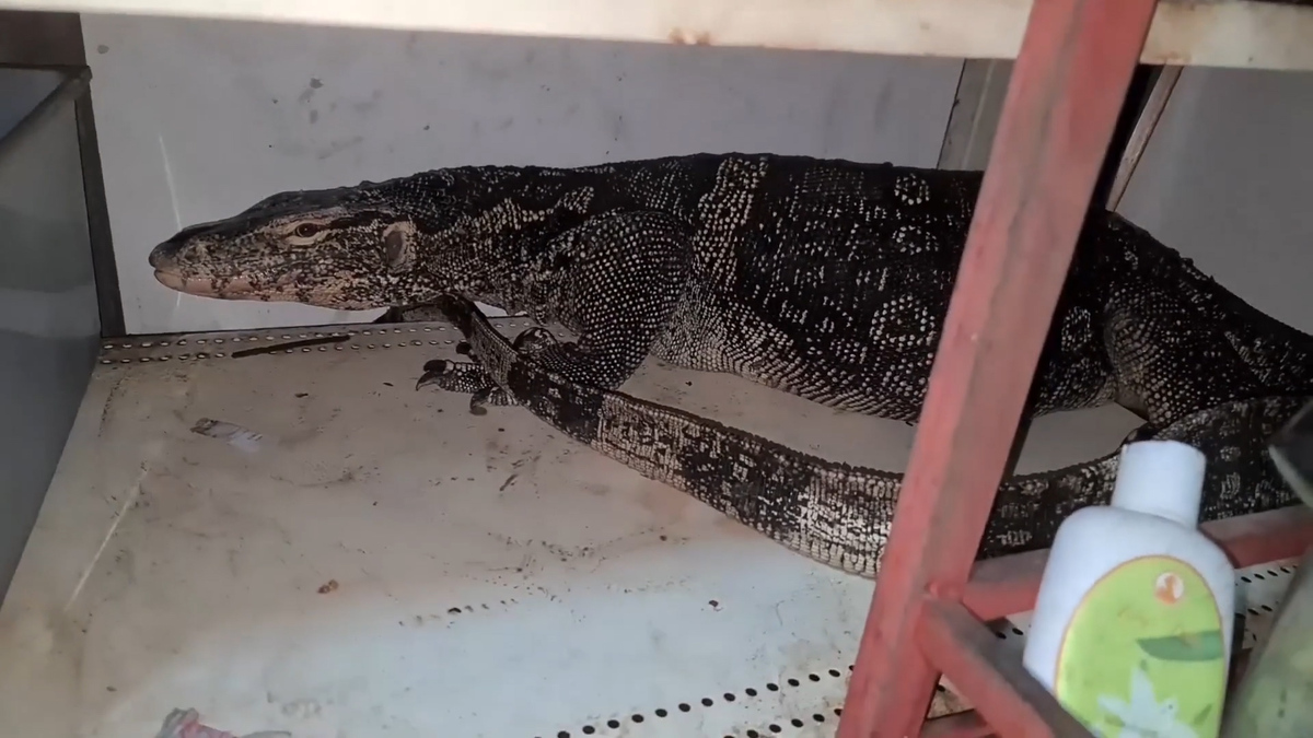 Con thằn lằn hung hãn xông vào một quán ăn tại Chonburi, Thái Lan để tìm kiếm bữa tối.