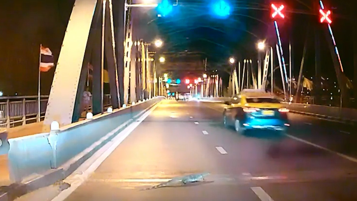 Con thằn lằn bất ngờ xuất hiện trên mặt cầu ở Bangkok, Thái Lan khiến các phương tiện đang di chuyển phải dừng lại để nhường đường.
