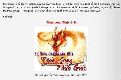 Theo trang chủ TLHK, đây là sự kiện mở đầu năm 2012 trong kế hoạch “Đánh thức Rồng Thần” của NPH. Nội dung sự kiện khá mở, đơn giản và được tổ chức out game tại diễn đàn để mọi người chơi có thể tham gia. Tuy nhiên để đạt được phần thưởng xem ra lại khá khó vì với phần thưởng như vậy thì số người chơi tham gia sẽ rất nhiều, tỉ lệ để chiến thắng của game thủ cũng sẽ giảm.