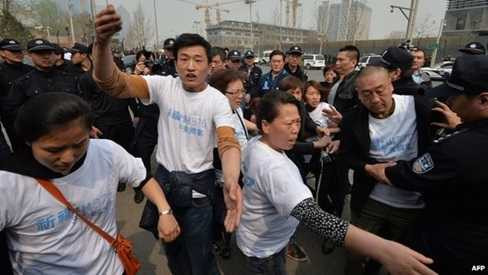 Khoảng hơn 10 người khác lập tức rời khỏi khách sạn do Malaysia Airlines thuê và đến biểu tình trước cửa sứ quán Malaysia ở Bắc Kinh.
