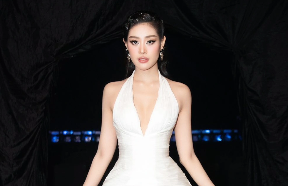 Trước khi xuất hiện trong vai trò vedette, Khánh Vân chọn váy trắng xẻ sâu ở ngực, khoe nhan sắc rạng rỡ trên thảm đỏ.