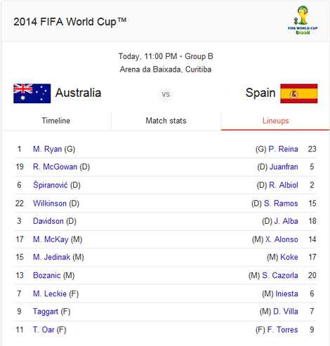 17': DỨT ĐIỂM... Tình huống sút bóng đầu tiên của Tây Ban Nha. Người kết thúc là Cazorla sau một tình huống bật nhả trong phạm vi hẹp với David Villa. Tuy nhiên, bóng không vượt qua được sự lăn xả của trung vệ Australia.