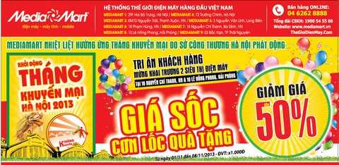 (VTC News) - Hưởng ứng Tháng khuyến mại Hà Nội 2013, Hệ thống thế giới điện máy Media Mart tặng miễn phí 1.250 phần quà, giảm giá đến 50% hàng loạt sản phẩm, giảm tiếp 5% khi thanh toán qua thẻ Vietinbank, hoàn tiên lên đến 15 triệu đồng cho TV, tủ lạnh, máy giặt, hỏng cũ đổi lấy mới tặng thêm 3.5 triệu đồng…