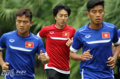 | HLV Miura chạy khởi động cùng các học trò (Ảnh: Hà Thành) |