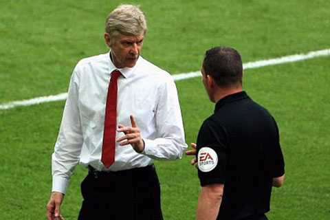 | Arsene Wenger ý kiến với các trọng tài về pha phạm lỗi không được hưởng 11m của Cazorla |
