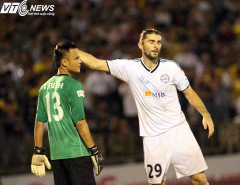 Phút 27: VÀO... VÀO... Hector nhận đường chuyền của đồng đội bên cánh trái, băng vào vòng cấm khống chế gọn gàng trước khi tung ra một cú sút. Bóng đi không có quá nhiều lực nhưng lại đúng đà băng về của trung vệ Phước Vĩnh. Sự lóng ngóng của trung vệ SHB Đà Nẵng đã gián tiếp làm nên bàn thắng cho đội chủ nhà khi bóng bật gót chân Phước Vinh vào lưới.