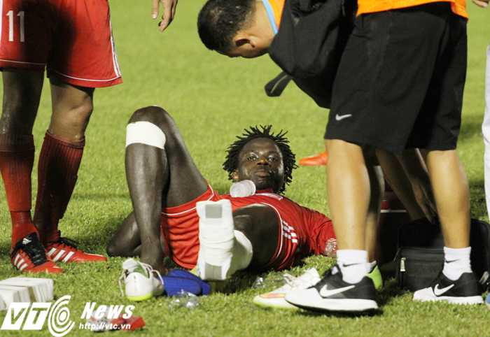 | Abass bị chấn thương nặng sau pha vào bóng của Thanh Hào (Ảnh: Hoàng Tùng) |