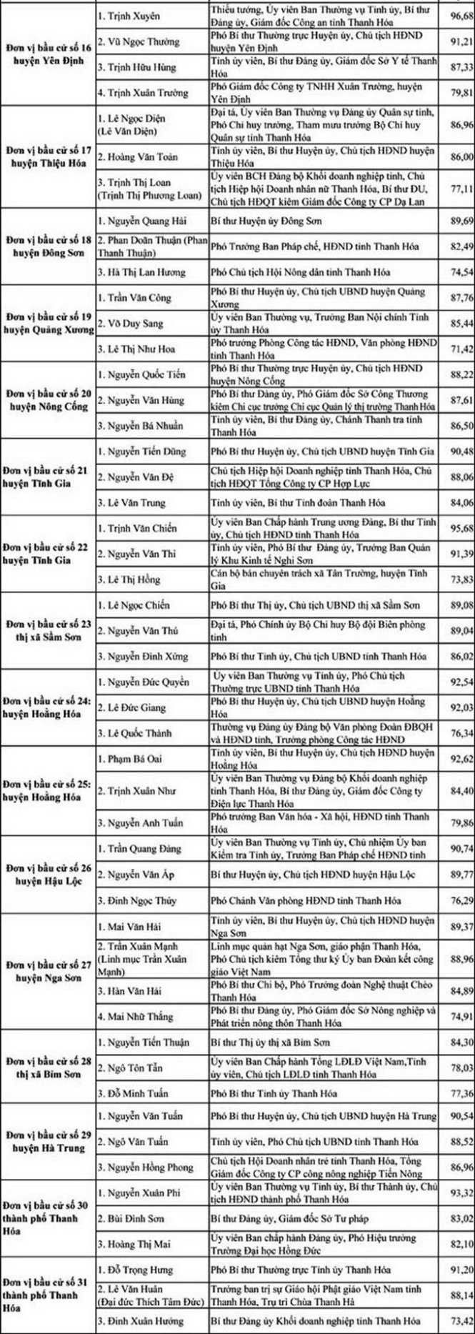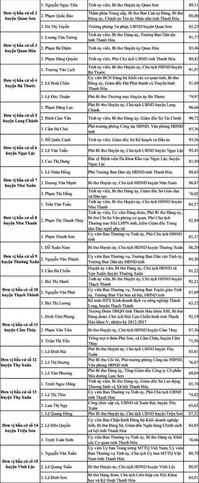 Danh sách những người trúng cử đại biểu HĐND tỉnh Thanh Hóa khóa XVII nhiệm kỳ 2016 - 2021:
