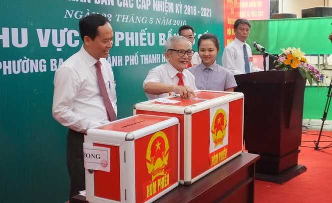 Ông Trịnh Văn Chiến - Ủy viên trung ương Đảng, bí thư Tỉnh ủy Thanh Hóa (bìa trái ảnh) bỏ phiếu bầu cử đại biểu Quốc hội và HĐND các cấp nhiệm kỳ 2016 - 2021 tại phường Ba Đình,