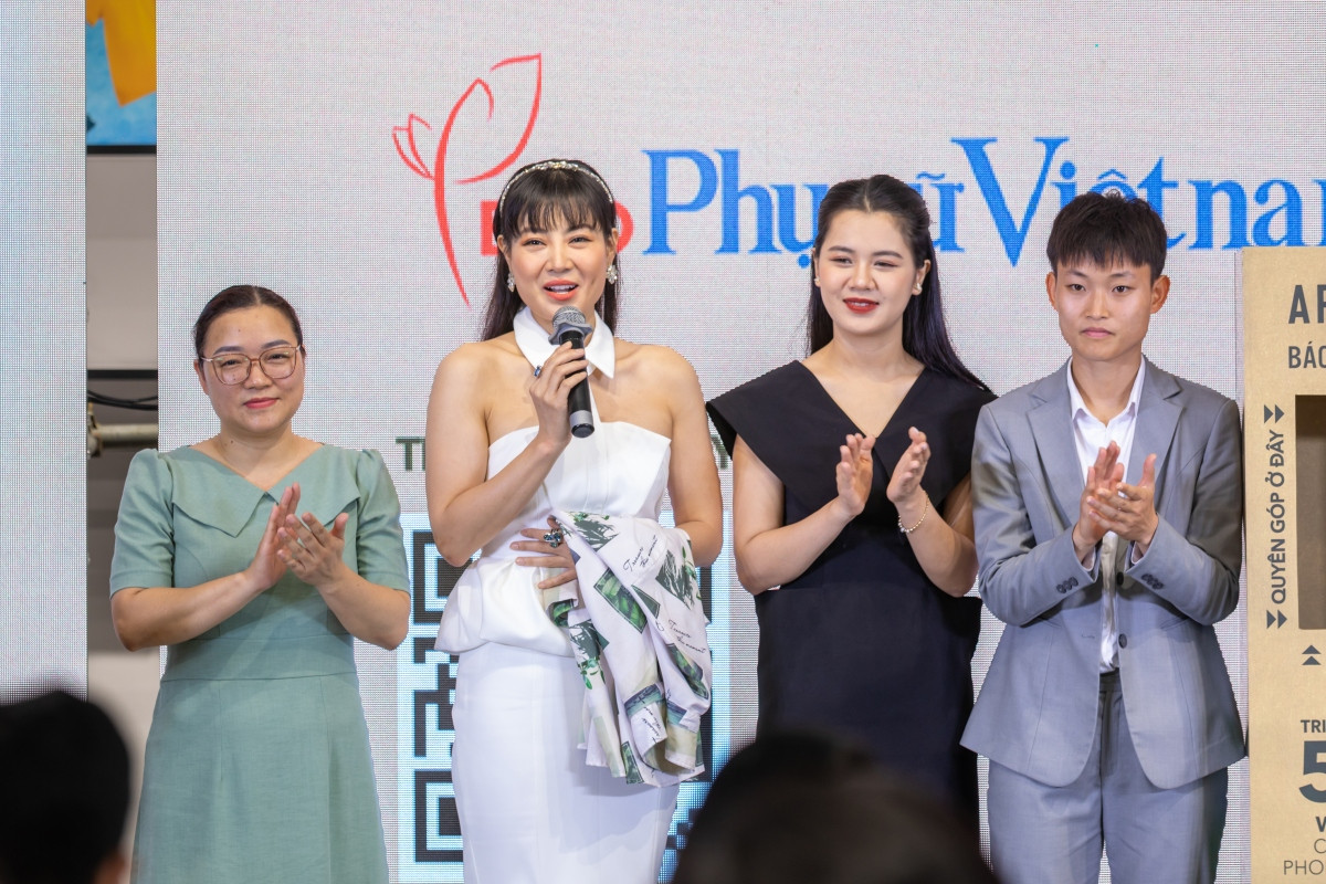 Thanh Hương cùng trung vệ tuyển Việt Nam Quế Ngọc Hải, thành viên tuyển nữ Việt Nam dự World Cup 2023 Hải Linh và các quan khách trong sự kiện.